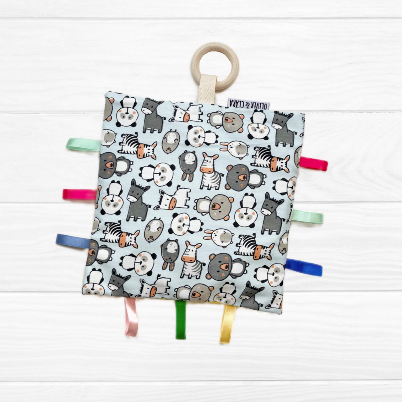 Manta sensorial para la estimulación temprana en guaguas. Estimula el tacto, el oído, y en general el descubrimiento. Por el frente tiene llamativos colores, cintas a los costados para despertar el interés y por detrás es de color liso y tela algodón.